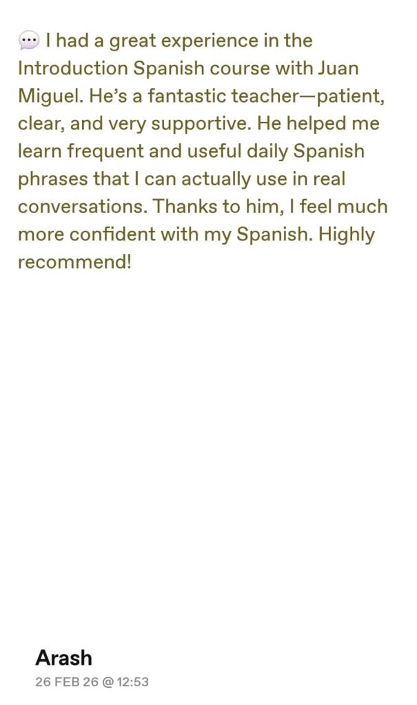 💬 I had a great experience in the Introduction Spanish course with Juan Miguel. He’s a fantastic teacher—patient, clear, and very supportive. He helped me learn frequent and useful daily Spanish phrases that I can actually use in real conversations. Thanks to him, I feel much more confident with my Spanish. Highly recommend!